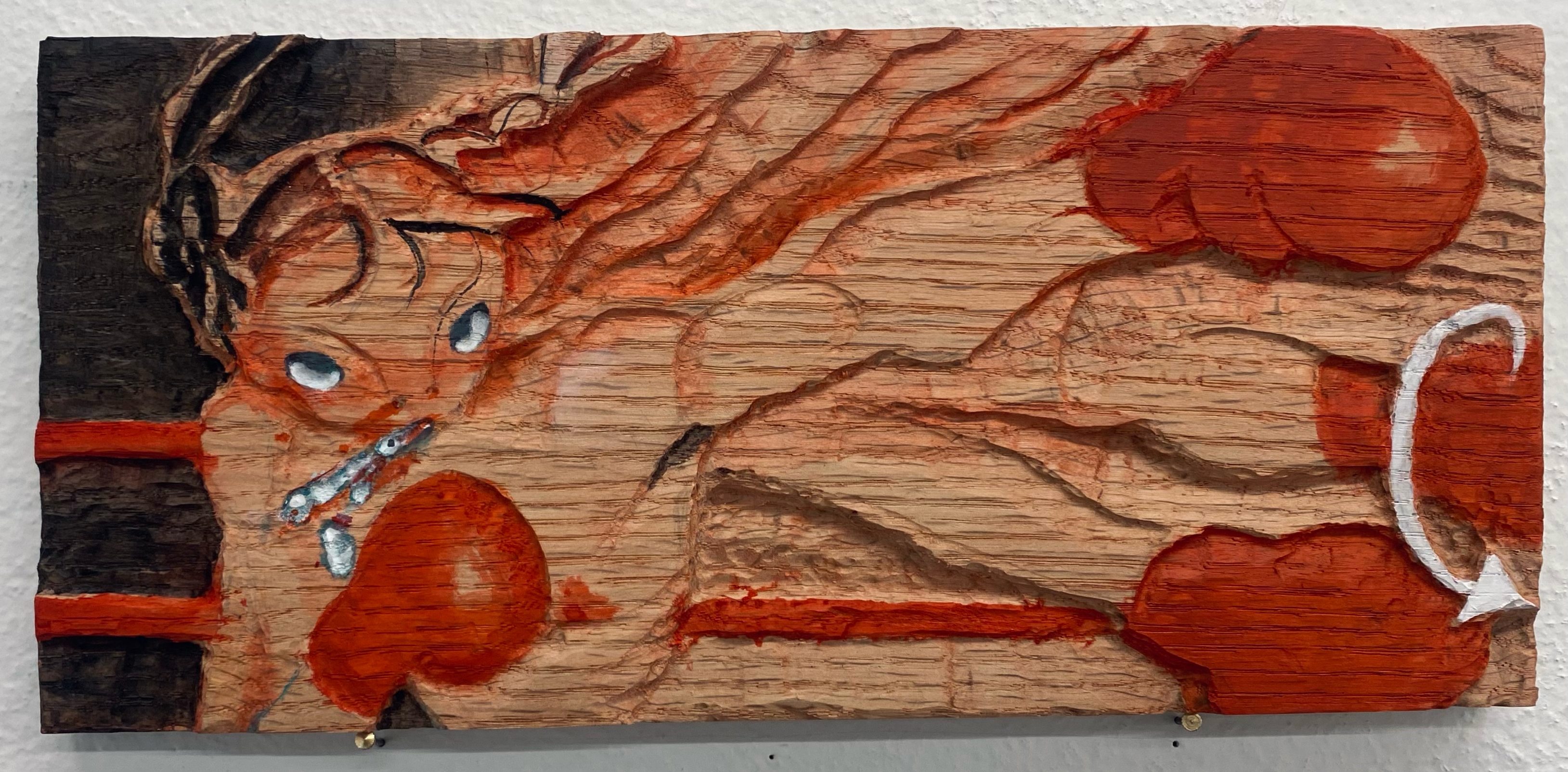The Girl McCoy’s Corkscrew Punch, 2023. Milk paint on oak relief, 6 x 12 x 2 inches.